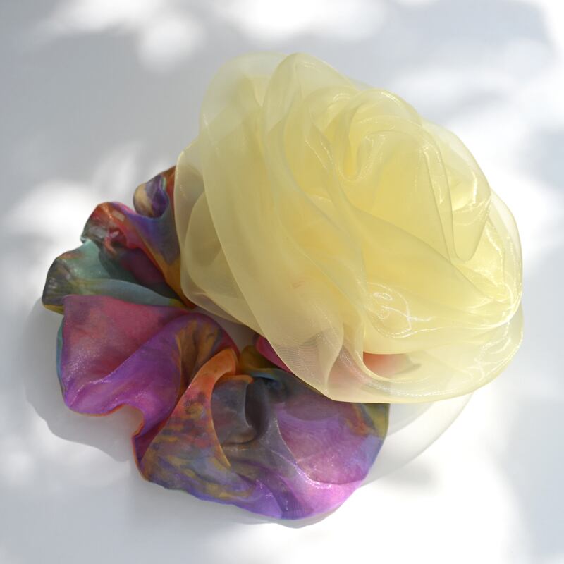 光に当たるとキラキラと輝くパールオーガンを使用した美しい作品です。優雅にデザインされたシュシュは、あえて大きく作られたバラのモチーフが印象的で、華やかさを添えます。ヘアアレンジにはもちろん、腕に着けてアクセサリー感覚でお楽しみいただける多用途なアイテムです。日常使いから特別な日まで、幅広く活躍します。