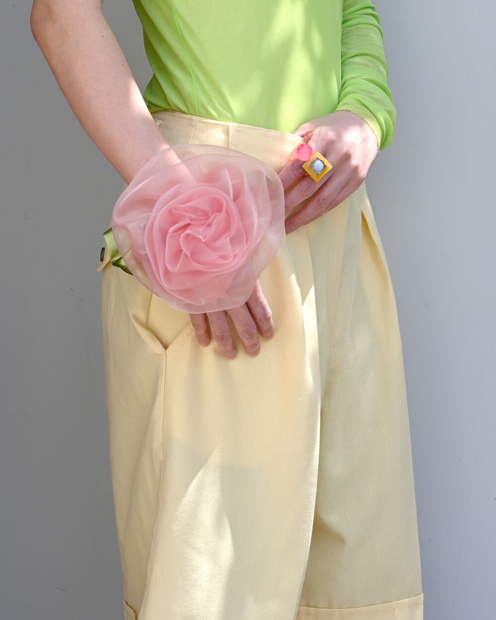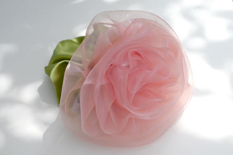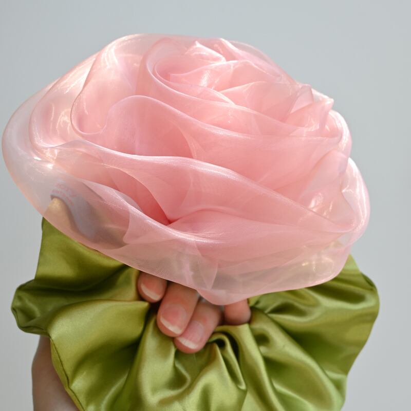 光に当たるとキラキラと輝くパールオーガンを使用した美しい作品です。優雅にデザインされたシュシュは、あえて大きく作られたバラのモチーフが印象的で、華やかさを添えます。ヘアアレンジにはもちろん、腕に着けてアクセサリー感覚でお楽しみいただける多用途なアイテムです。日常使いから特別な日まで、幅広く活躍します。
