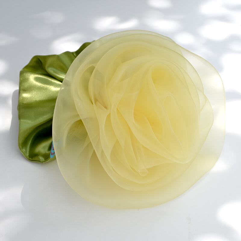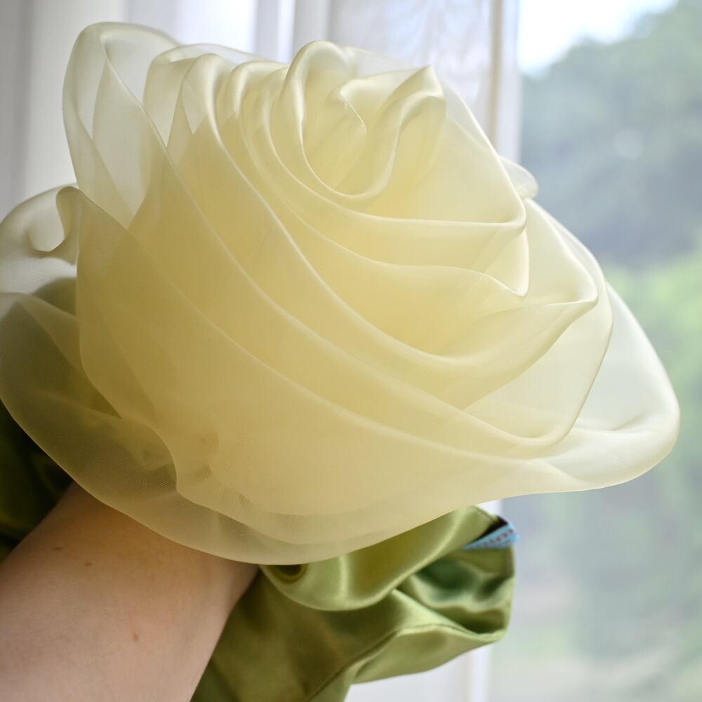 光に当たるとキラキラと輝くパールオーガンを使用した美しい作品です。優雅にデザインされたシュシュは、あえて大きく作られたバラのモチーフが印象的で、華やかさを添えます。ヘアアレンジにはもちろん、腕に着けてアクセサリー感覚でお楽しみいただける多用途なアイテムです。日常使いから特別な日まで、幅広く活躍します。