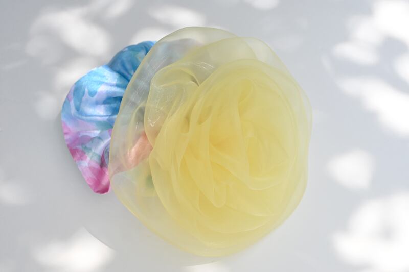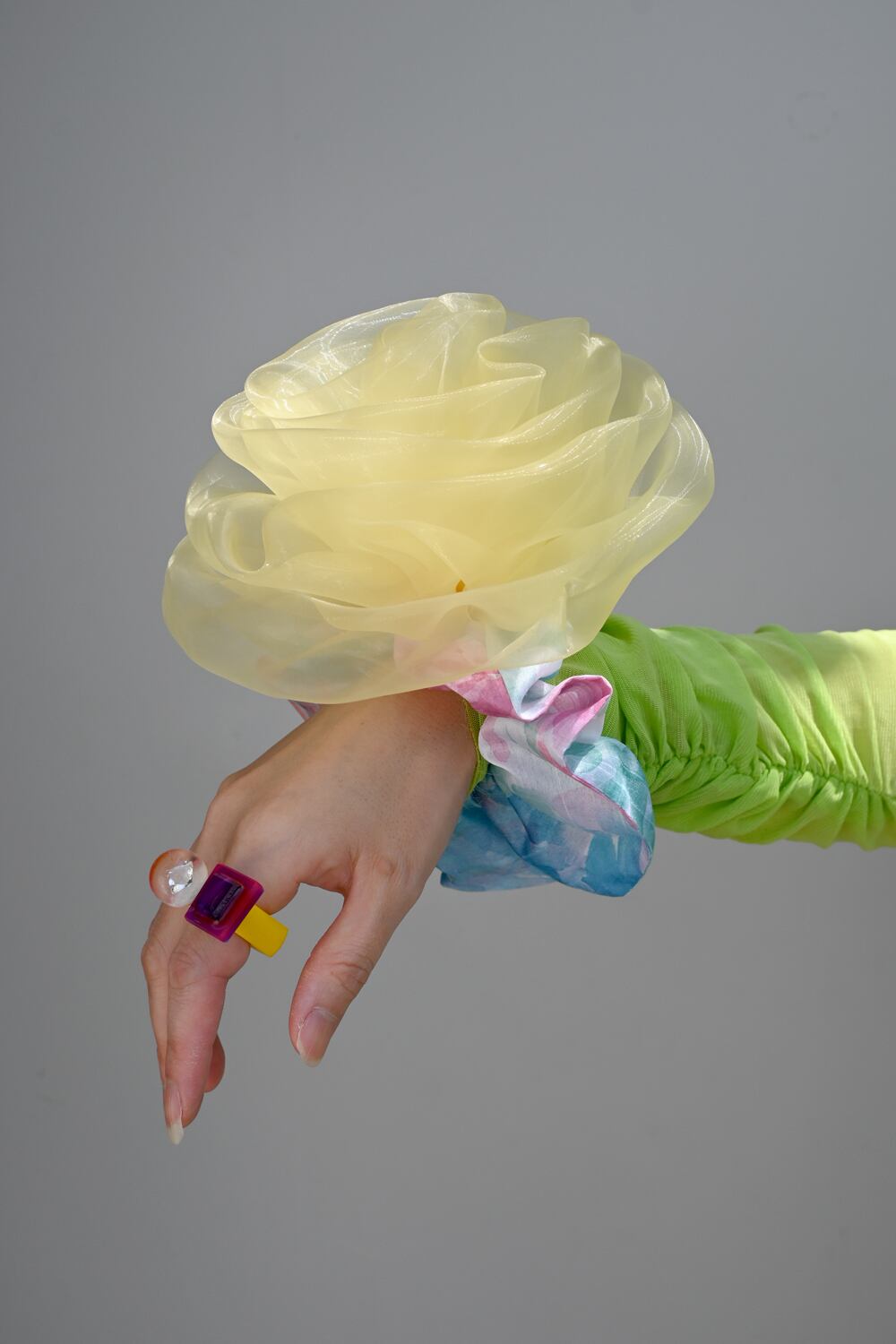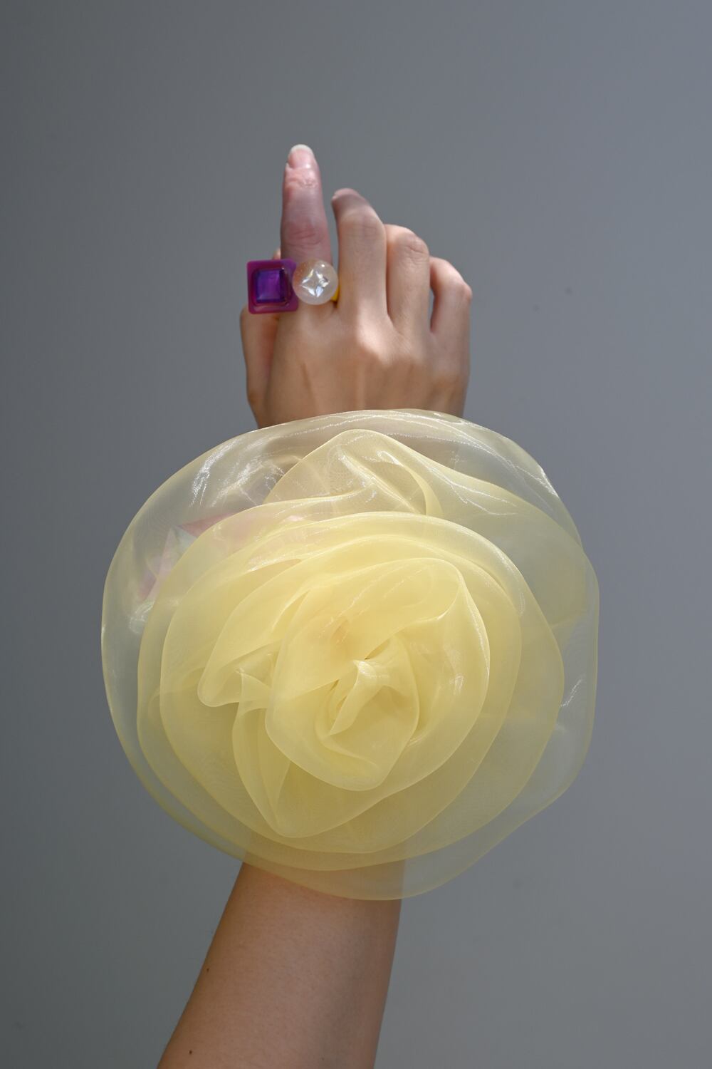 光に当たるとキラキラと輝くパールオーガンを使用した美しい作品です。優雅にデザインされたシュシュは、あえて大きく作られたバラのモチーフが印象的で、華やかさを添えます。ヘアアレンジにはもちろん、腕に着けてアクセサリー感覚でお楽しみいただける多用途なアイテムです。日常使いから特別な日まで、幅広く活躍します。